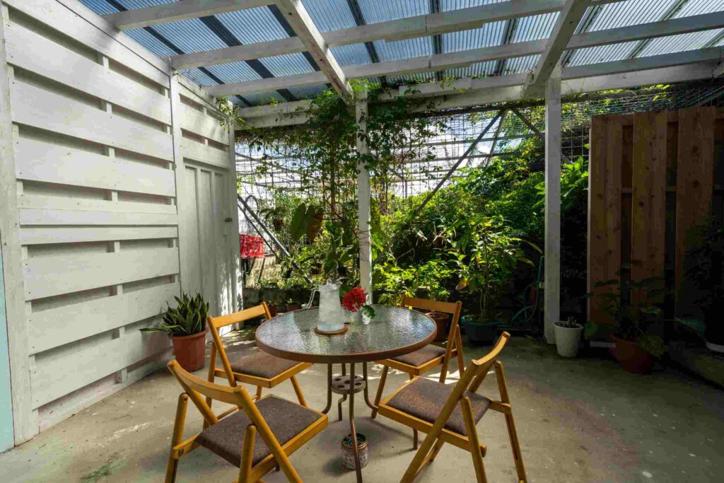 庭にもテーブル席があり、晴れた日はグリーンの菜園に囲まれ気持ち良いです。