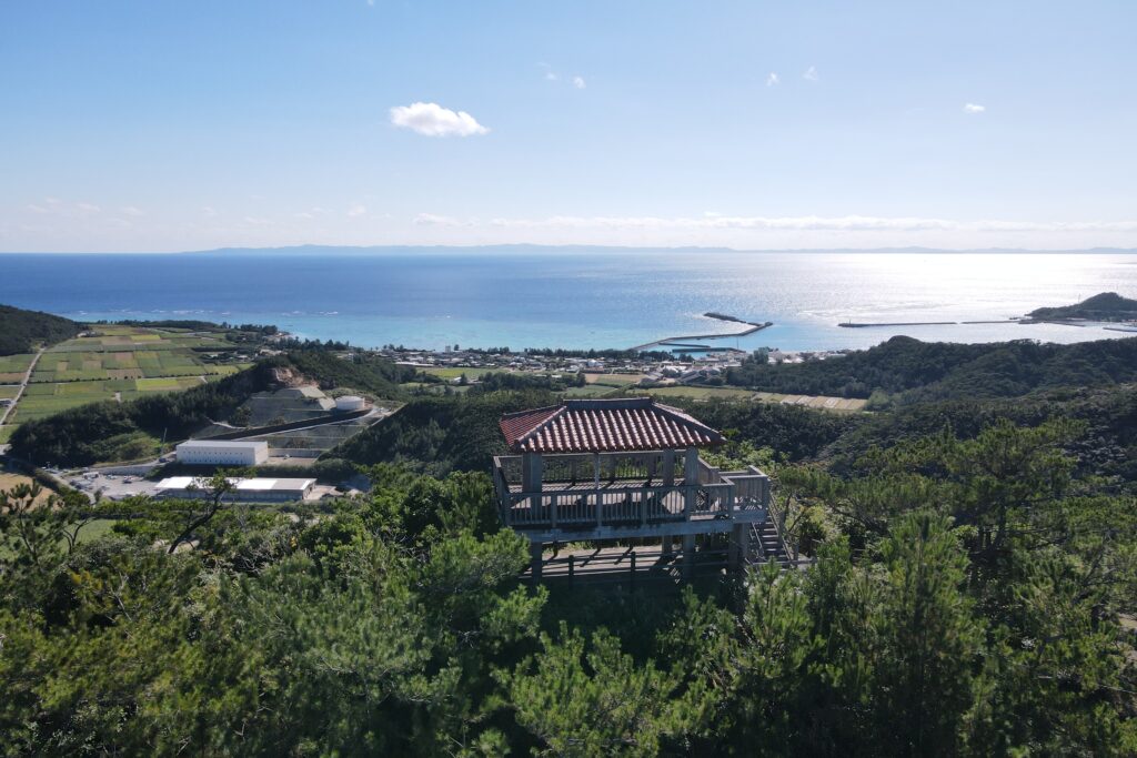 標高170メートルほどの展望台からは、眼下に前泊集落から田名へ続く田畑と、