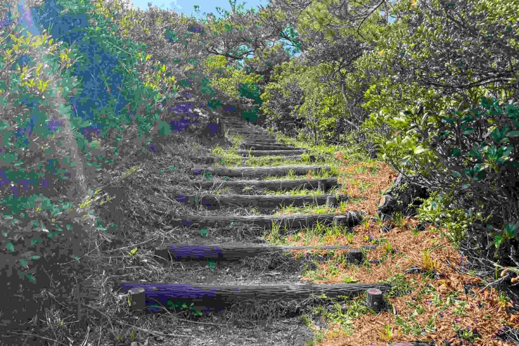 駐車場から展望台までは険しめの山道となっています。サンダルは危険ですのでスニーカーなどで登りましょう。